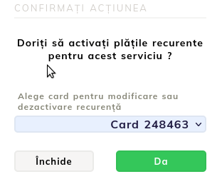 - La nouvelle fenêtre qui s'ouvre nous demande de sélectionner une carte enregistrée dans le compte. Nous sélectionnons la carte à partir de laquelle nous souhaitons que le montant soit retiré et cliquons sur OUI. Si l'opération a réussi, le message "Le paiement récurrent a été activé" s'affichera.