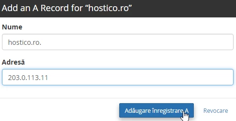 - Dans le champ Nom, nous ajouterons le nom de domaine pour lequel nous ajoutons l'enregistrement A (hostico.ro) et dans le champ Adresse, nous ajouterons l'adresse IP IP (IPv4) du serveur hébergeant le domaine 203.0.113.11.
