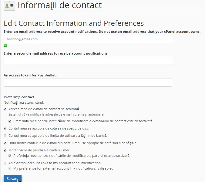 - Dans notre cas, nous ajouterons l'adresse de contact hostico@gmail.com et nous vérifierons les notifications suivantes :