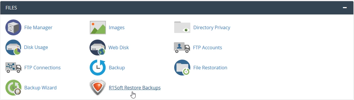 - Une fois le panneau de contrôle accédé, nous allons dans la section Fichiers et cliquons sur R1soft Récupérer des sauvegardes.