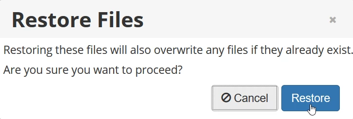 - Nous recevrons un message d'avertissement, nous informant que les fichiers existants dans le dossier sélectionné seront remplacés par ceux de la sauvegarde. Si nous souhaitons conserver une copie des fichiers actuels, nous pouvons renommer le dossier en utilisant File Manager ou un client FTP, afin que le contenu du dossier ne soit pas remplacé par les fichiers de la sauvegarde (par exemple, renommer public_html en public_html_old).