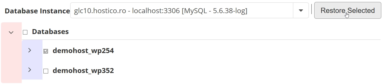 - Ensuite, les bases de données existantes seront affichées dans le point de restauration. Nous cocherons la case à gauche de la base de données que nous souhaitons restaurer et cliquerons sur Restaurer sélectionné en haut à droite de la page. La restauration remplacera la base de données existante. Si nous ne voulons pas perdre les informations qu'elle contient, nous pouvons télécharger une copie actuelle en utilisant PhpMyAdmin.