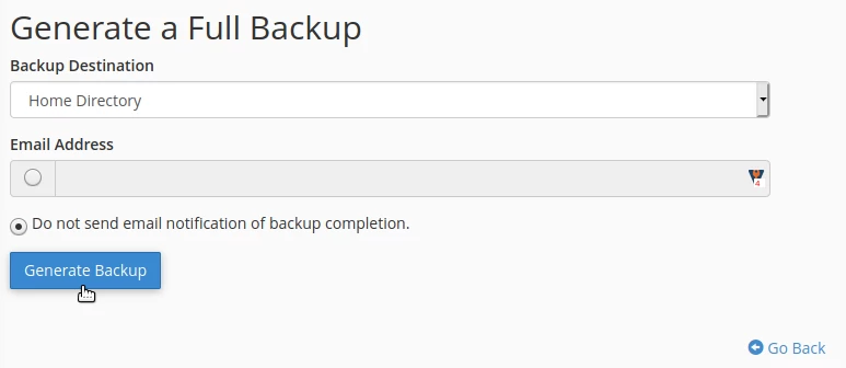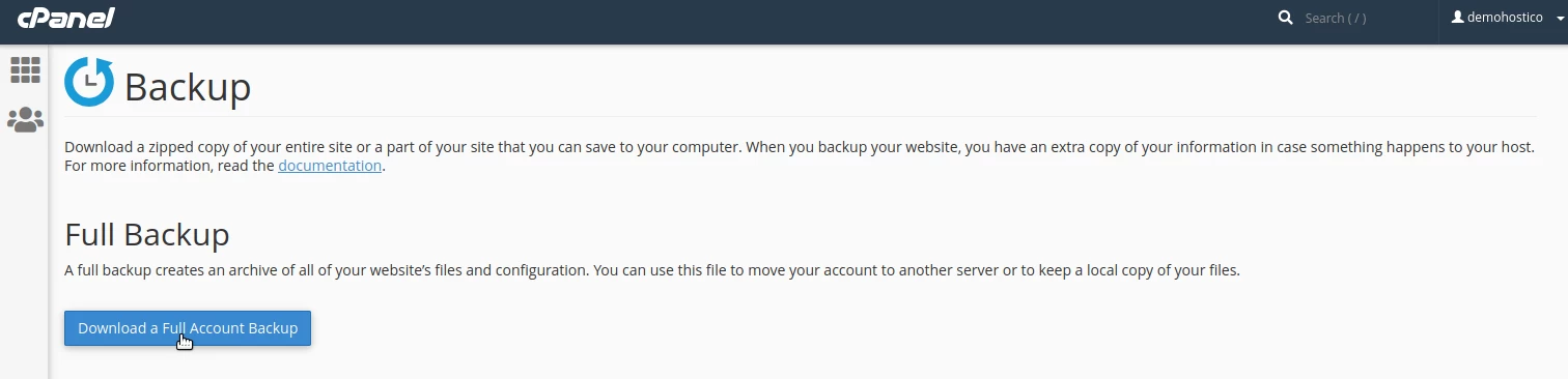 • Cette option créera une archive avec tous les fichiers et paramètres du compte à sauvegarder, mais à partir de l'interface cPanel, cette archive ne peut pas être utilisée pour une restauration complète d'un site. Pour une restauration complète, vous devrez nous contacter par e-mail à : help@hostico.com