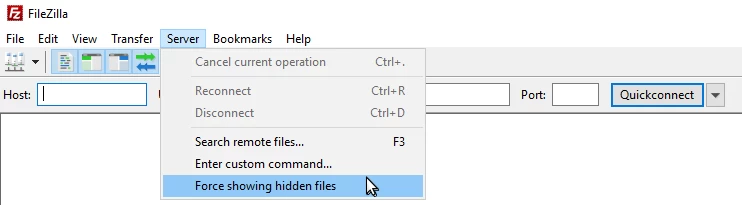 - Pour activer l'affichage des fichiers cachés, cliquez sur Serveurs dans la barre d'options de FileZilla, puis cochez l'option Forcer l'affichage des fichiers cachés.